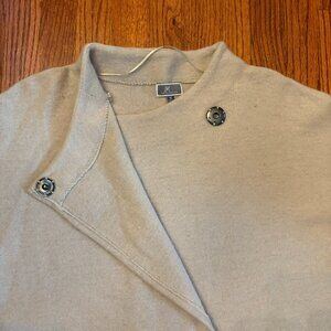 Elegant and cozy JM Collection beige knit sweater jacket in size XL. Features a chic asymmetrical front closure with snap buttons and a striking beaded jewel embellishment for added sparkle. Three-quarter sleeves and relaxed fit make it perfect for layering. Great for dressy or casual looks.