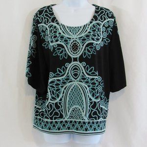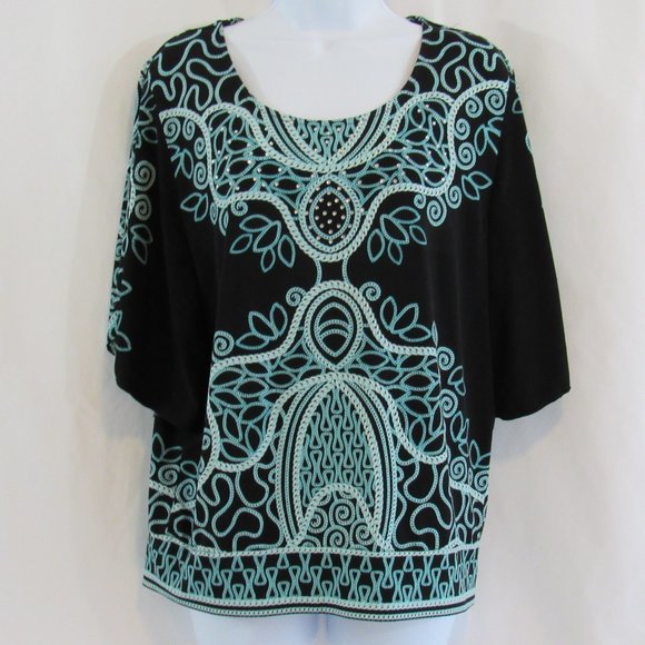 JM COLLECTION Women's Size M, Short Sleeve, Black, Blue Pullover stretch Top