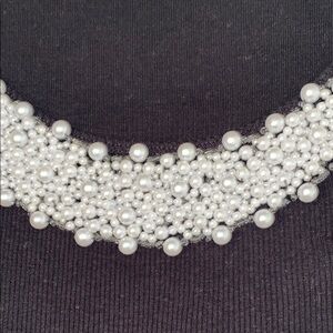 This chic black tank top from JM Collection features a sleeveless design with a pearl embellishment along the neckline, adding a touch of elegance to its classic style. The embellished detail creates a necklace-like accent, making it a standout piece for any occasion.