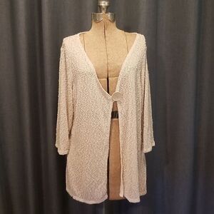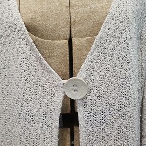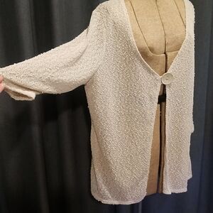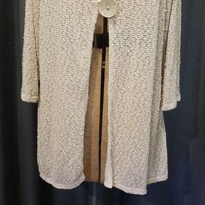 Beautiful cardigan with on button on front the size tag was removed but it's a large please view photos for dimensions and size still has part of the tag attach if you have any questions please ask before purchase