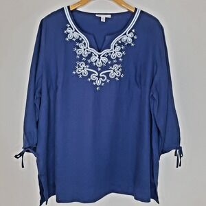 JM Collection 100% Linen Tunic Top Sz 22W Navy Blue Coastal Beachy Boho Island