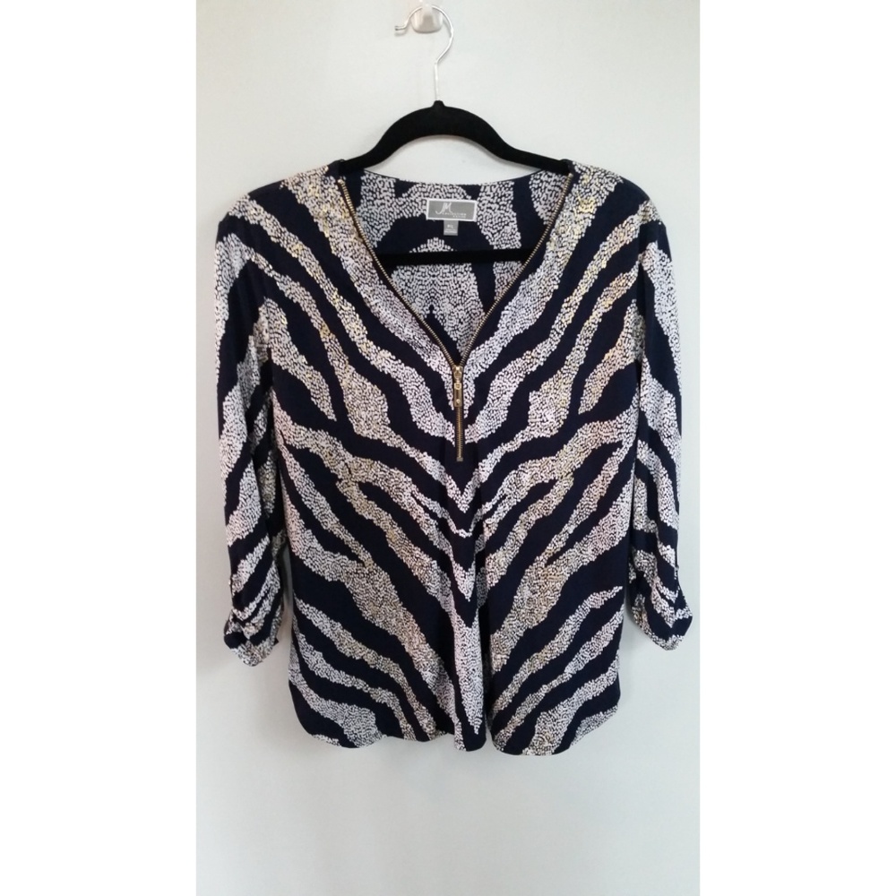 Nice Navy, silver, and a splash of gold top. Top to bottom 25 1/2 in. Pit to pit 19 in.