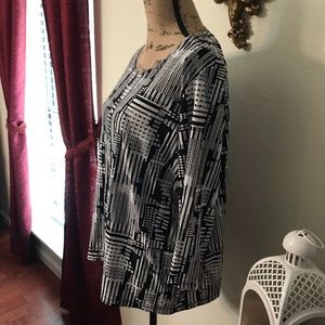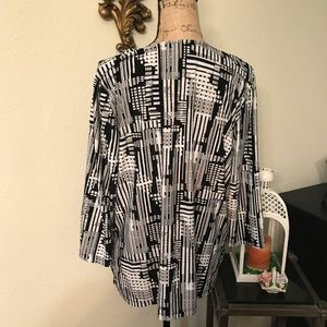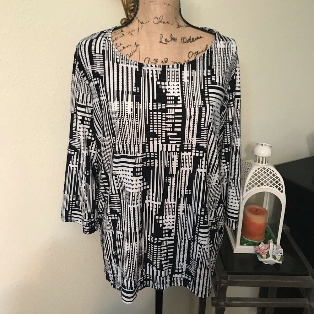 Beautiful JM Collection 3/4 sleeve tunic in excellent gently loved condition. Material has some stretch. Soft and comfy. Dresses up for work or down with jeans.