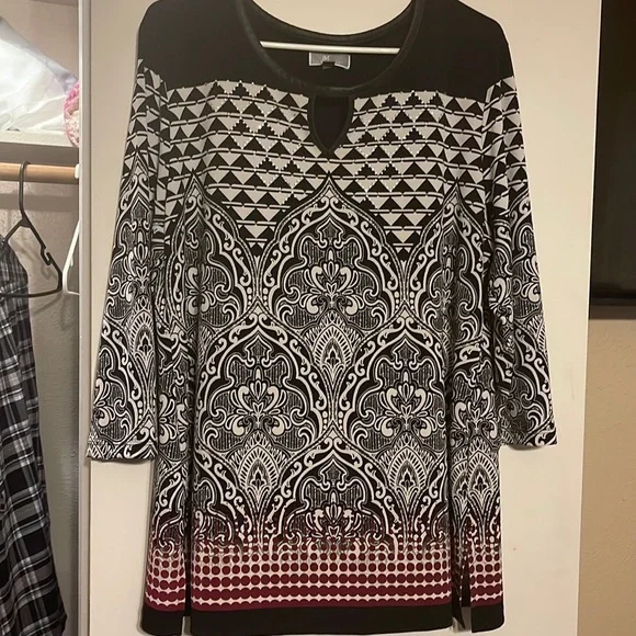 Material? Length? Smoke free home? What is the color at the bottom - red, maroon, rust? Thanks.