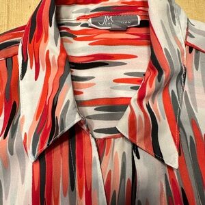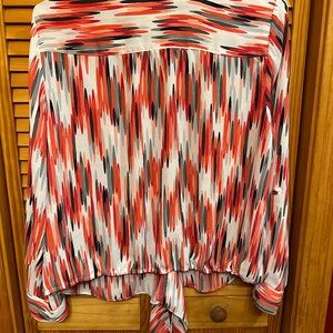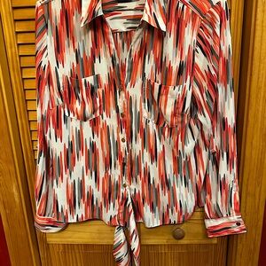 Red black, gray white pink-multicolor striped with rollup sleeves. The shirt sits at your waist with a tie in front. Pit to pit is 22 inches. Shoulder to hem is 23 inches.