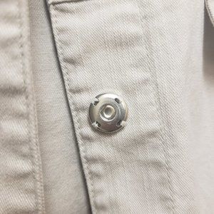 This elegant jacket is perfect for a day in the office or a night out. It has 5 button snaps down the front and 2 front pockets. The sleeves are 3/4 length and can be rolled up for added style. The front collar has acrylic rhinestones around it for extra detail.