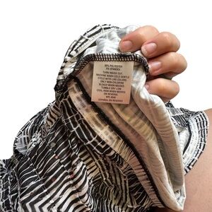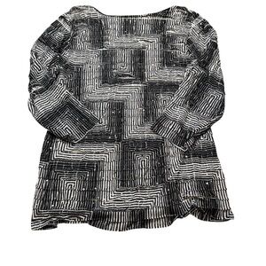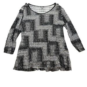 Elegant JM Collection pleated shimmer pullover top featuring a bold black-and-white striped geometric pattern. Designed with stretch for comfort and style, this long sleeve top works perfectly for casual outings or dressier occasions. Women’s size Medium, in very good used condition.