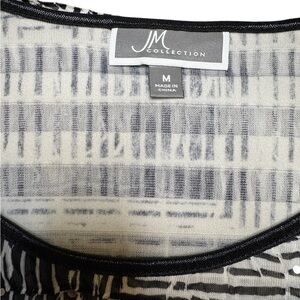 JM Collection pleated top, shimmer black white blouse, stretch pullover shirt M, women’s dressy top, geometric striped blouse, JM Collection medium, long sleeve shimmer top