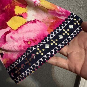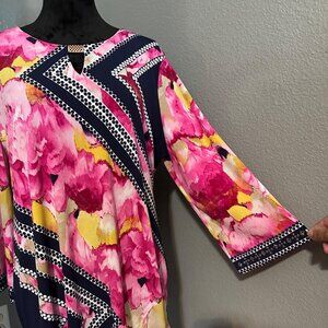 Features a vibrant pink, yellow, and navy geometric floral print with gold and silver stud embellishments at the sleeves. Soft, stretchy knit fabric with 3/4 sleeves and keyhole front detail — stylish, comfortable, and flattering for work, church, or casual wear.