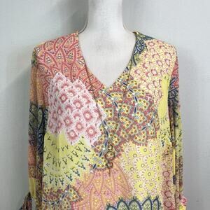 JM Collection Blouse Tunic size Large Pink Yellow Paisley Sheer Necklace Peasant