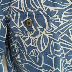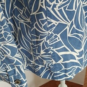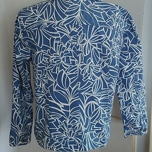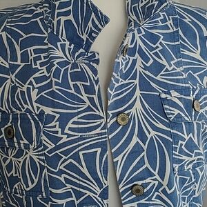 JM Collection, Blue & White Geometric Cotton Jacket.Sz 10., 💯 Cotton denim jean jacket. Gorgeous blue and white print. Semi fitted, button front.