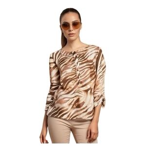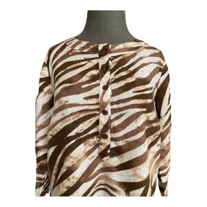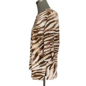 JM Collection Brown Tan Animal Print Linen Blouse Crewneck Women’s Shirt Top