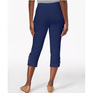 Buckle details at the side hem create a dramatic flair for these classic capri pants by JM Collection in a skinny, pull-on silhouette. Mid rise; front: slim fit through hips and thighs; skinny cropped leg Pull-on style Buckle detail at side hem Rayon/nylon/spandex; panel: nylon/spandex Machine washable Imported **these pants are red NOT blue**Size: Womens SP Condition: New With Tags