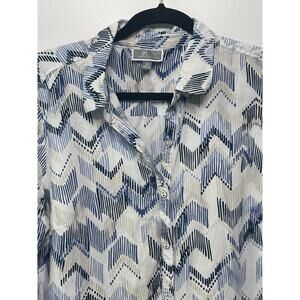 JM Collection Button Up Linen Blouse Blue White Print Pattern Travel Summer M