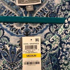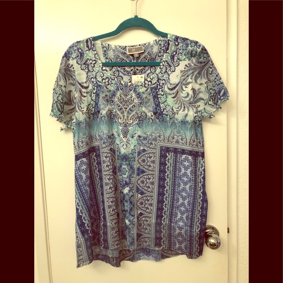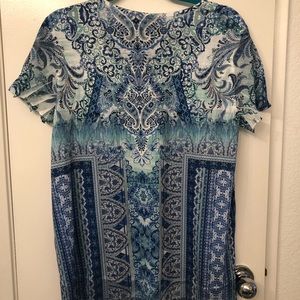 Cute short sleeve blue teal and white graphic print with raised silver dot detail. From Macy’s JM Collection women line