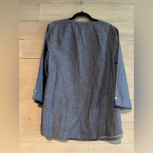 Chic denim blue tunic with pearl details. Perfect for everyday style.