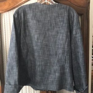 Perfect for the air conditioned office. Jean like fabric with some stretch to it. 3/4 length sleeves with cuff. Zipper front with detailed trim. Very cute! Like new.