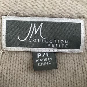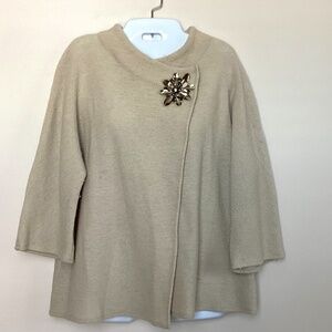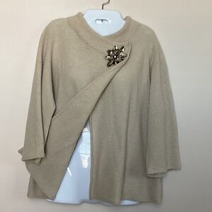 JM Collection Petite Embellished Asymmetrical Wool Cardigan in New Sierra Sand (tan, beige color). Beautiful steel grey anthracite crystal brooch embellishes the mock turtle high neck. Open front and boxy fit with swing feel. 100% wool. Some pilling, shown in photos and priced accordingly. Size Petite Large. Hand wash.