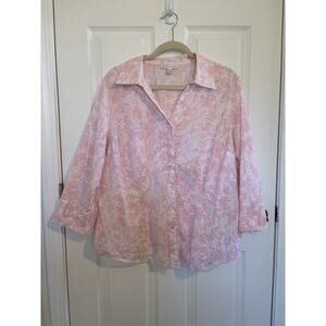 JM Collection Embroidered Pink Floral 100% Cotton Button Up Size 1X Romantic