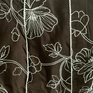 Deep chocolate brown color with white embroidered floral, print and white trim, running vertical throughout
