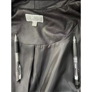 JM Collection Women Black Faux-Leather, Open-Front, Shoulder-Padded, Lined, Long-Sleeve Jacket Size Medium. Good Pre-owned Condition With no holes. HAS SOME STAINS, SOME SMALL STAINS ON FRONT COLLAR RIGHT SIDE NOT TOO NOTICEABLE, AND HAS FEW MORE INSIDE THE JACKET, THESE ARE NOT NOTICEABLE FROM OUTSIDE, SEE PICTURES FOR CONDITION PLEASE. For material and care see pictures please.