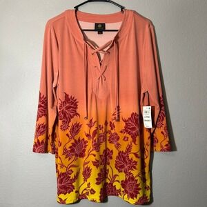JM Collection Floral Print Top Lace-Up 3/4 Sleeve Blouse Orange Size L NWT