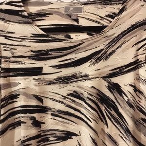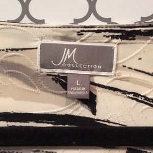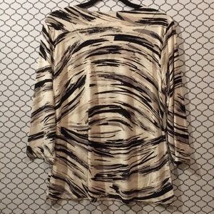 JM Collection black, grey & cream Flowy, textured top with 3/4 length sleeves. Good pre-owned condition, no flaws. Size Large.