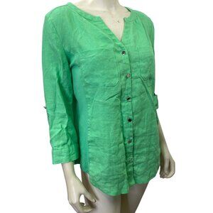 JM Collection Green Button-Down Blouse Size 10 With Roll-Tab Sleeves SZ 10