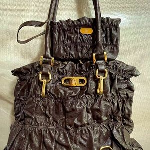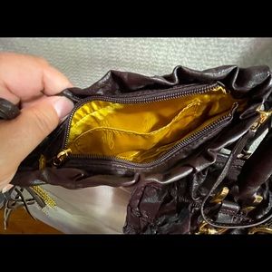 Inside has 1 medium zipped pocket on one side, the second side has two smaller pockets for all your needs. Beautiful gold hardware on both sides that can increase the size of the handbag.
