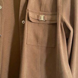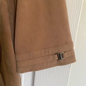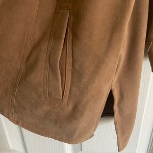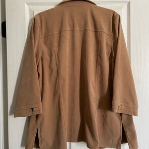 JM Collection casual light tan jacket. Made of polyester blend with snaps, front and side pockets with a slit on the sides. Sleeves are shorter then normal length.
