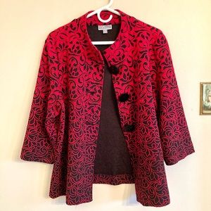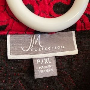 This beautiful suit jacket by JM Collection is in excellent condition. The size is P / XL. The material is 77% cotton, 22% polyester, and 1% spandex. The length measures 27”. Across the chest measures 22.” Three-quarter length sleeves. The colors are black and red. 🚭