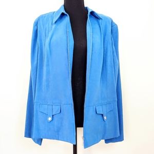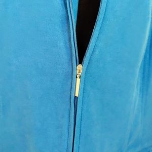 Long sleeve jacket / blazer. Medium blue color. Zip front. Snap pockets at waist. Polyester... But kind of has a soft "suede" feel.