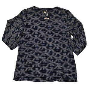 Effortlessly stylish, this JM Collection top features shimmery jacquard stripes and hardware for an instantly sleek look. Relaxed fit Scoop neckline with hardware, keyhole 3/4-sleeves Polyester/metallic/spandex Machine washable ImportedSize: Womens M Condition: New With Tags