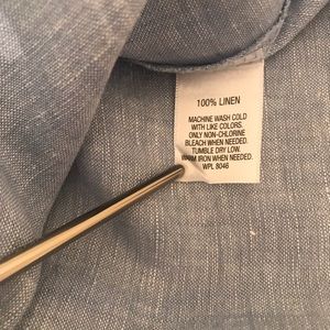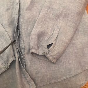 This lightweight linen top is both stylish and comfortable. It features a button-tab sleeve and hidden buttons at the bottom.