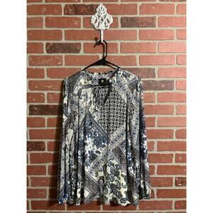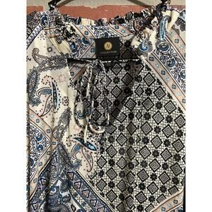 Mixed print long sleeve top size XL. Top features white tank lining inside, ties that fall from the neckline, and bit oversized. Fabric feels comfortable and breathable. Sleeves have elastic at the ends for an adjusted fit. Great for casual wear or work wear.