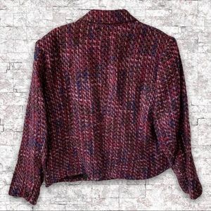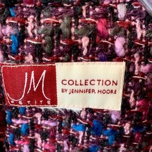 đź’• This cute JM Collection Multicolor Boxy Tweed Jacket is perfect to pair with a black skirt or pants in one of the thread colors of the jacket. The size tag was clipped off, so exact size is unknown. However, the measurements correspond to about a size 14P. Fabric feels rather like a wool, acrylic, cotton blend