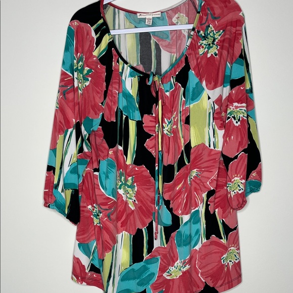 Chic blouse with striking floral design. Features red, teal, and black tones. Ideal for a fashionable outfit.