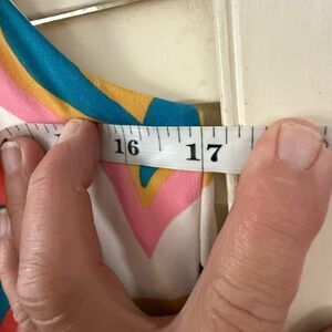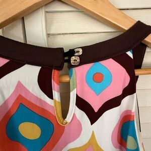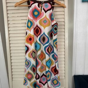 Vibrant mini dress with geometric pattern. Features a mix of colors for a bold look. Sleeveless design with a round neckline.