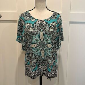 JM Collection Petites SS Patterned Top, Size LP. Top is in EUC with no rips, tears, stains or holes. Smoke and pet free home (2644*)