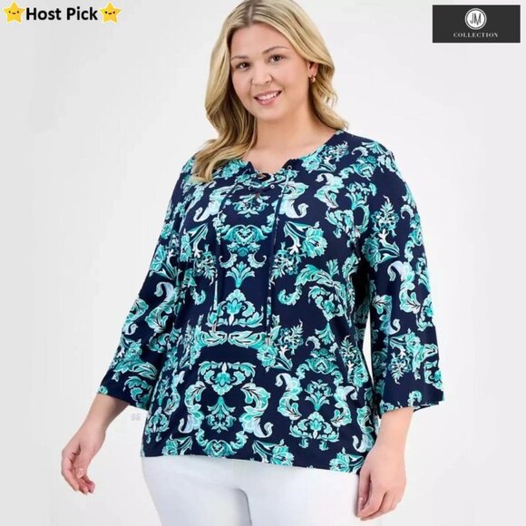 JM Collection, plus size 1X, paisley tunic, turquoise top, navy blouse, lace‑up neckline, 3/4 sleeve, lyocell blend, soft fabric, flattering fit, travel ready, weekend chic, NWT