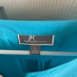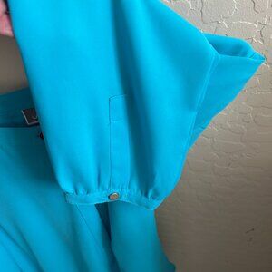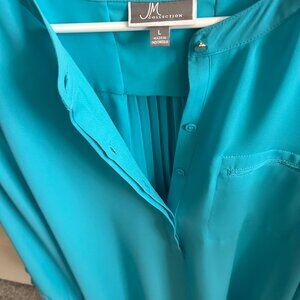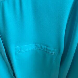 Robin Egg blue 100% polyester long sleeved bouse. Buttons are hidden panel. silver toned top button.