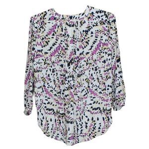 JM Collection provides feminine finesse with this pleated blouse, featuring 3/4-blouson-sleeves. Relaxed fit; Split neckline with button detail Pleated detail at top center back; asymmetrical hem Blouson 3/4-sleeves Polyester Machine washable Imported Web ID: 10565726Size: Womens M Condition: New With Tags