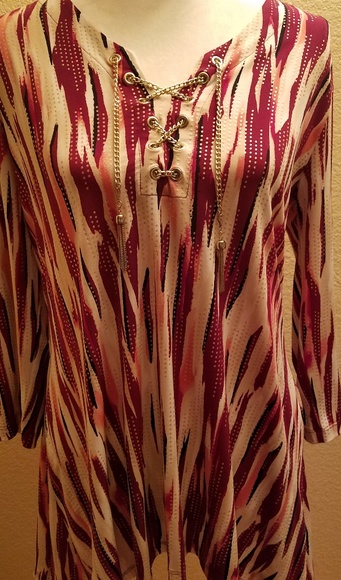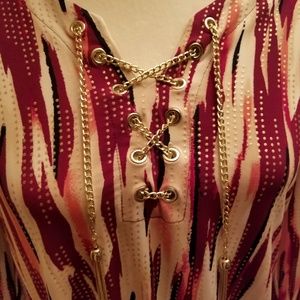 Gently used Pullover with front chain closure in beautiful color mix of burgundy, pink, and cream in size medium.