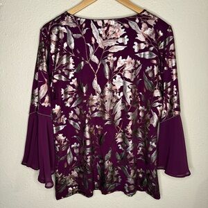 JM Collection Purple Blouse Floral Metallic Trim Sheer Sleeve Women’s Sz Large