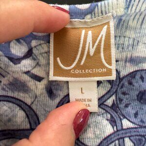 Beautiful JM Collection women’s top featuring a striking purple and white mandala print with sparkling rhinestone accents.