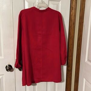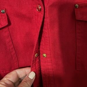 Red linen 3/4 sleeves snap jacket- JM Collection. Split side hem and cuffed sleeves. Light weight- just right for indoor wear over anything