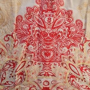 Vibrant top with red and cream patterns. Features intricate design and soft fabric.