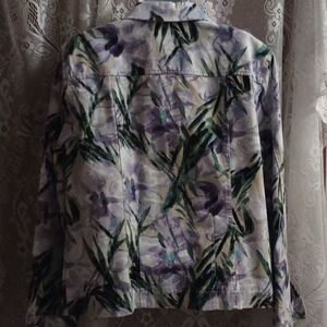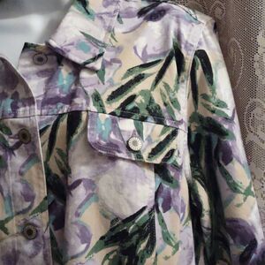 JM Collection women's size 14 tropical Floral print 100% cotton jacket button front two front pockets purple teal yellow green aqua on white background button on cuffs excellent condition