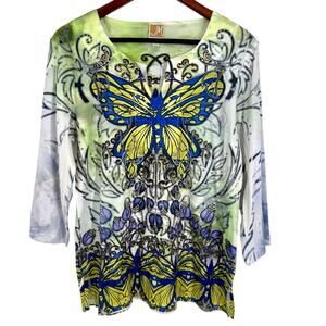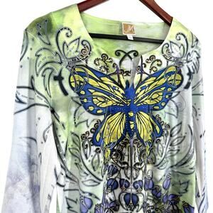 JM Collection Sz Large Green Purple Butterfly Sparkly Blouse Shirt Top Artsy