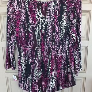 JM Collection SzS 3/4Sleeve Round Neck Curved Hem Pnk/Blk Abstract NWT